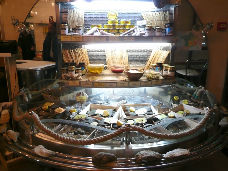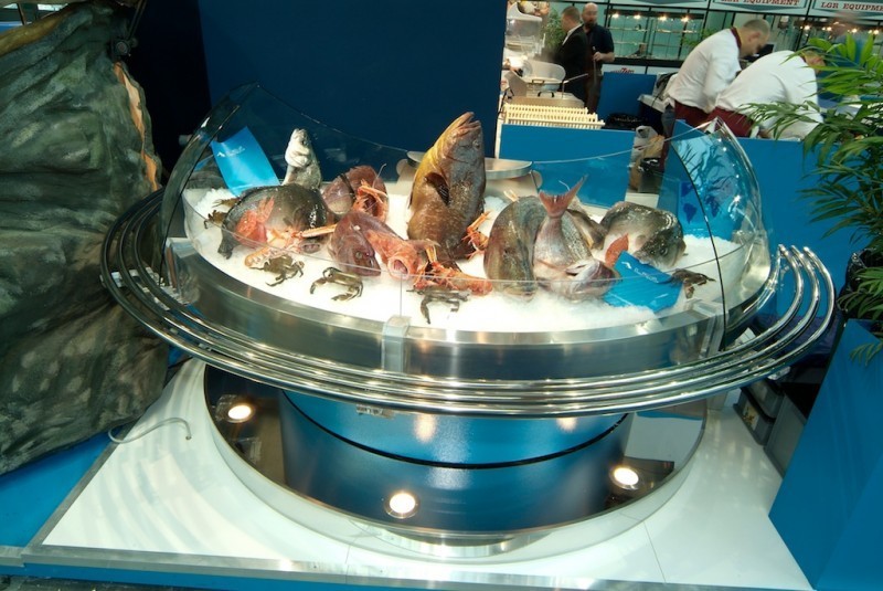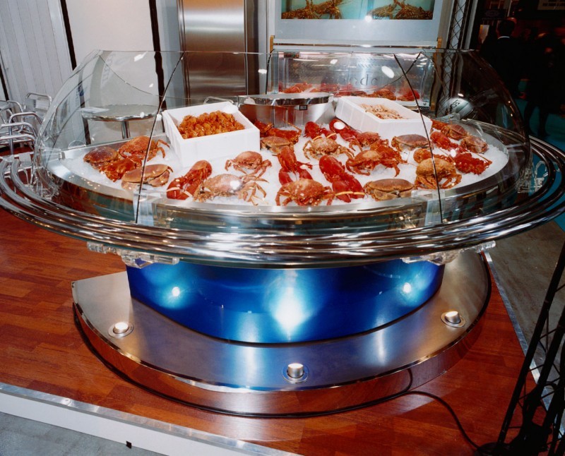 Bases perforadas de acero inoxidable con rejilla y drenaje de agua para el lavado diario del expositor.