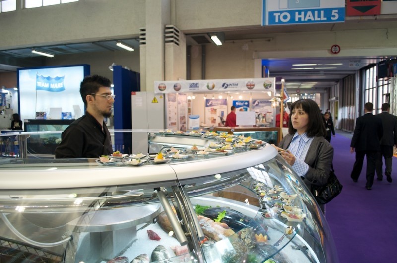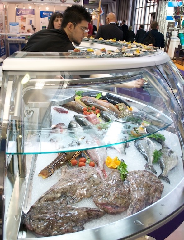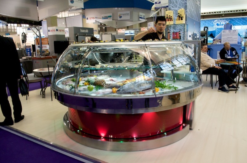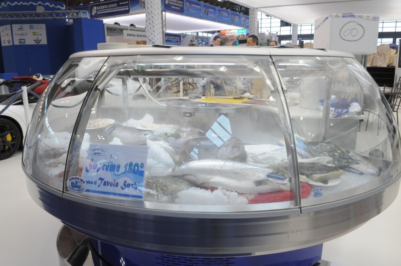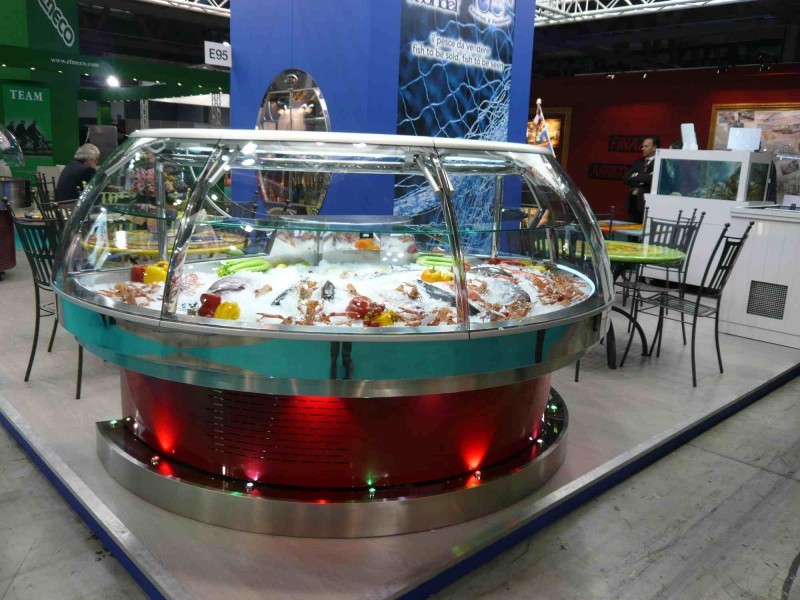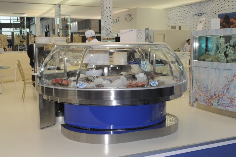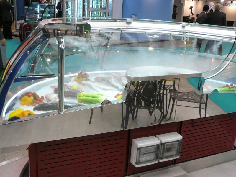• Bases perforadas de acero inoxidable con rejilla y drenaje de agua para el lavado diario del expositor.